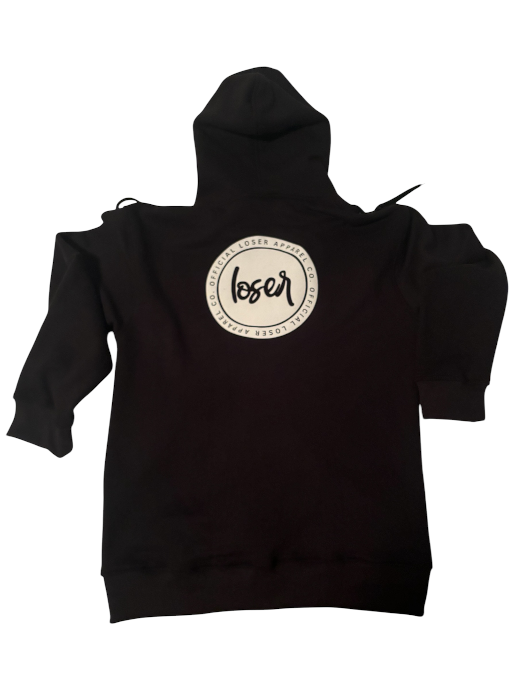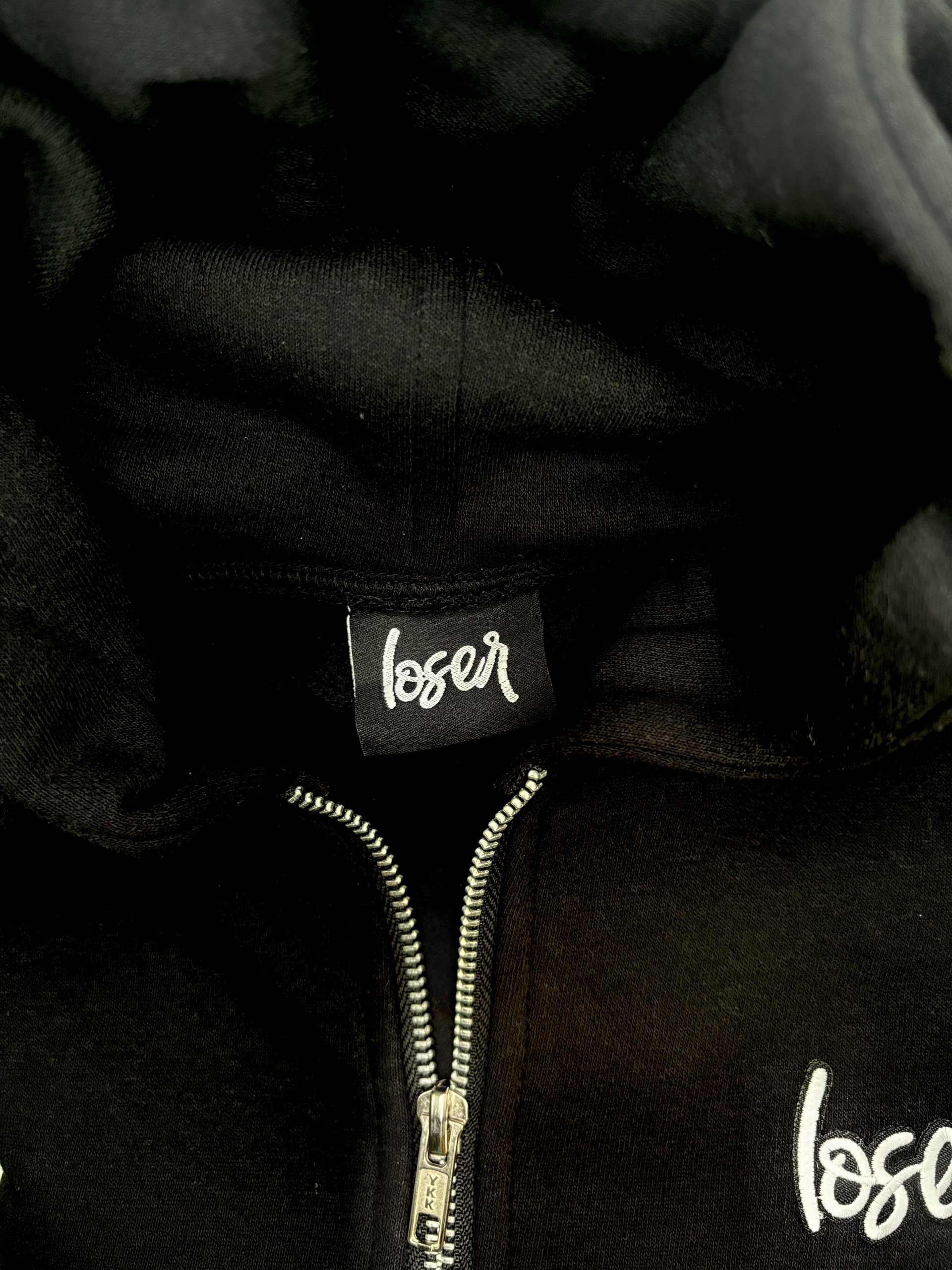 Sleek, versatile, and undeniably bold—the Loser Apparel Black Zip-Up Hoodie is your new go-to for everyday style. Featuring an embroidered Loser logo on the front crest and an embossed Loser crest logo on the back, this hoodie speaks confidence without saying a word.